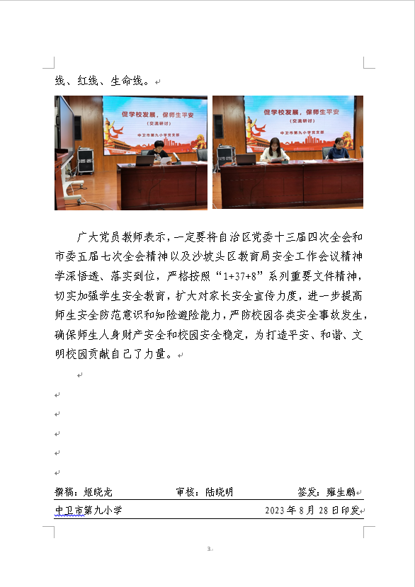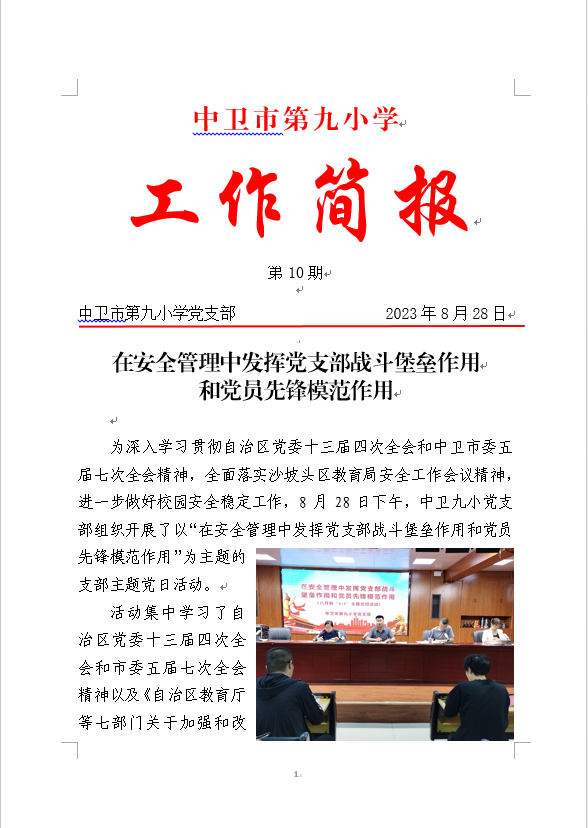 发布时间:2023-08-29 11:40 栏目:党建动态 发布单位:中卫市第九小学 点击量:4374 【公开】