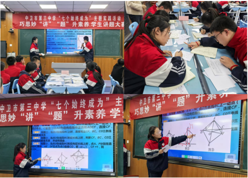 为积极响应 “七个始终成为” 主题活动要求,深入推进素质教育,提升学生数学核心素养,中卫三中数学组精心策划并组织了一场别开生面的《巧思妙 “讲”,“题” 升素养》活动。此次活动于 2024 年 11 月 19 日第七节课在学校智慧教室(综合楼二楼)盛大举行,九年级学生踊跃参与。本次活动面向九年级学生,旨在提升学生对数学知识的理解和应用能力,培养学生的逻辑思维、表达能力、创新能力和解决问题的能力,提高学生数学核心素养。