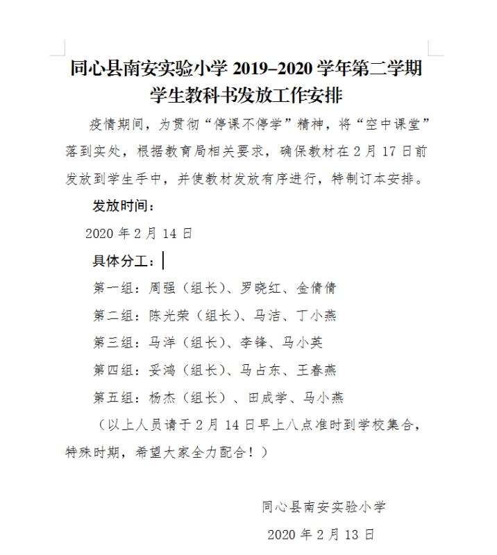 根据区、市、县级文件精神,为了确保全体学生的学习不受疫情影响,顺利开展“空中课堂”在线课程,2月13日南安实验小学成立教科书发放工作小组,2月14日开展“送书上门”活动。