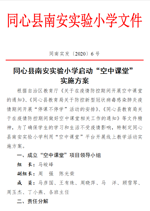 对于“空中课堂”课程,校领导高度重视及时提前部署任务,安排教师采用打电话、发微信的形式告知每一位家长线上课程表,要求家长按照学校的通知、要求熟悉宁夏教育台、教育云、云校家APP等平台的使用,并细心协调解决收看设备问题,以实现全校学生足不出户进行线上学习。